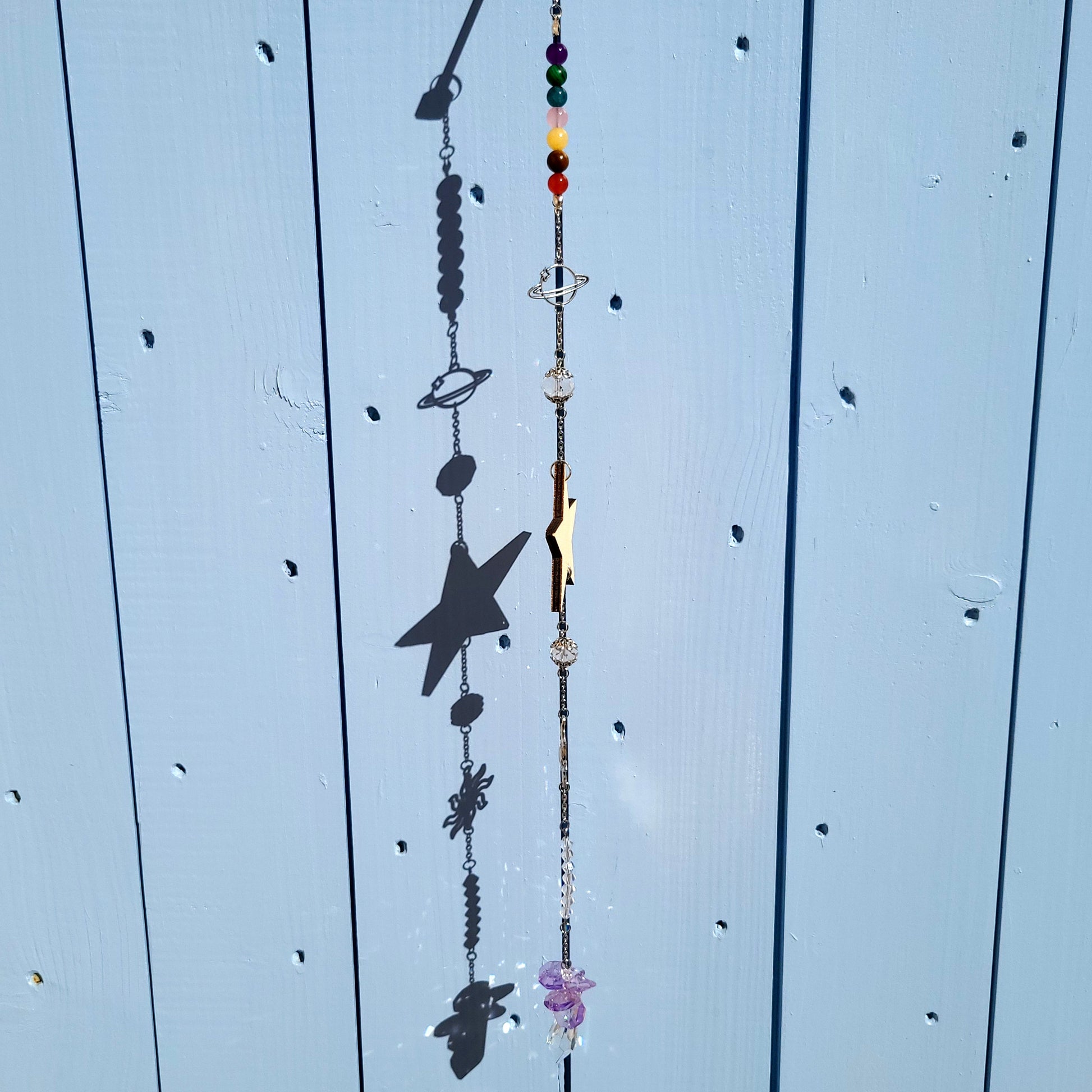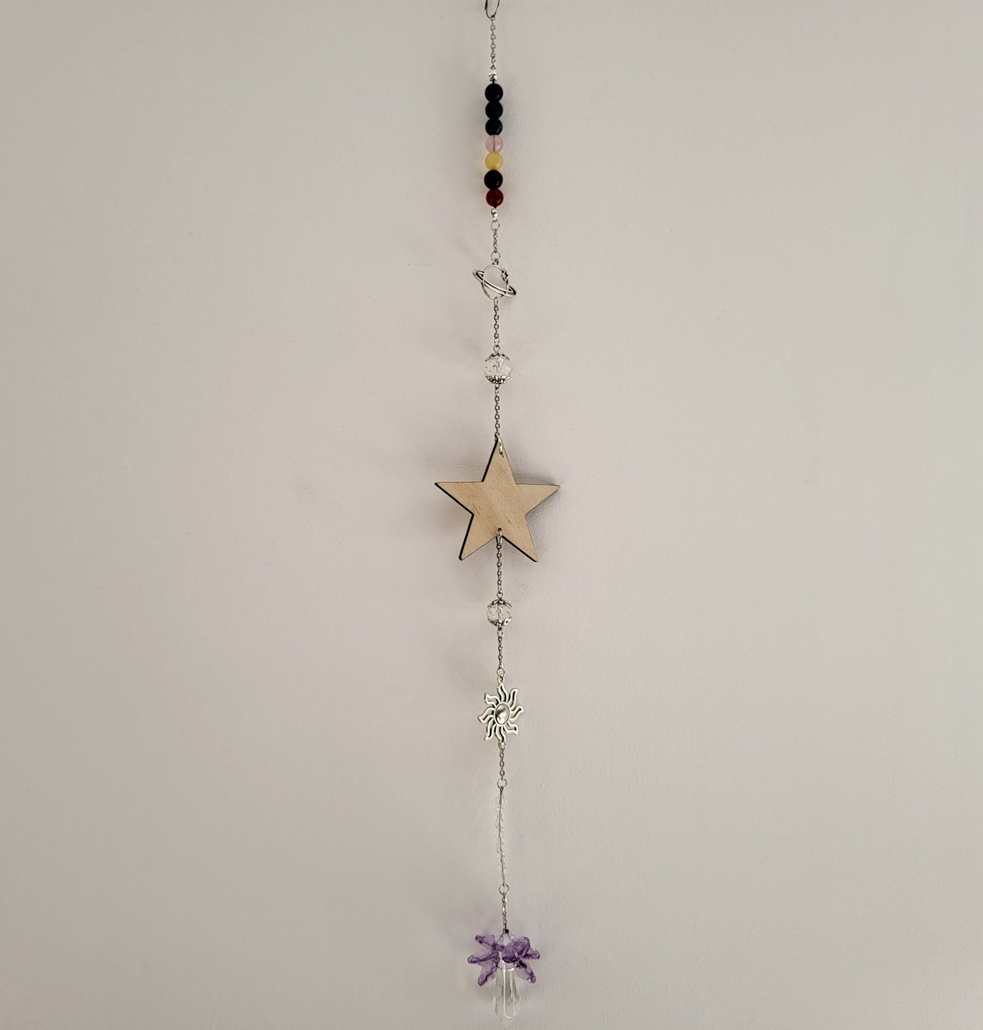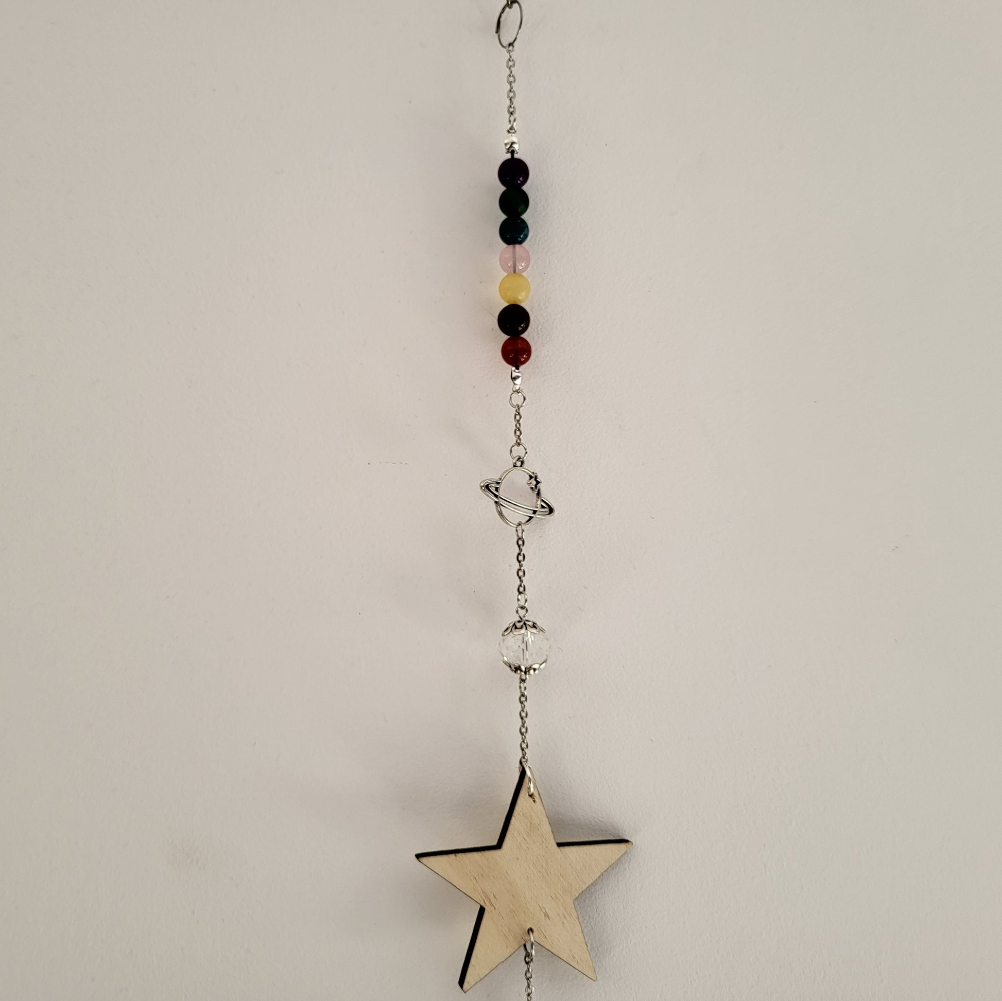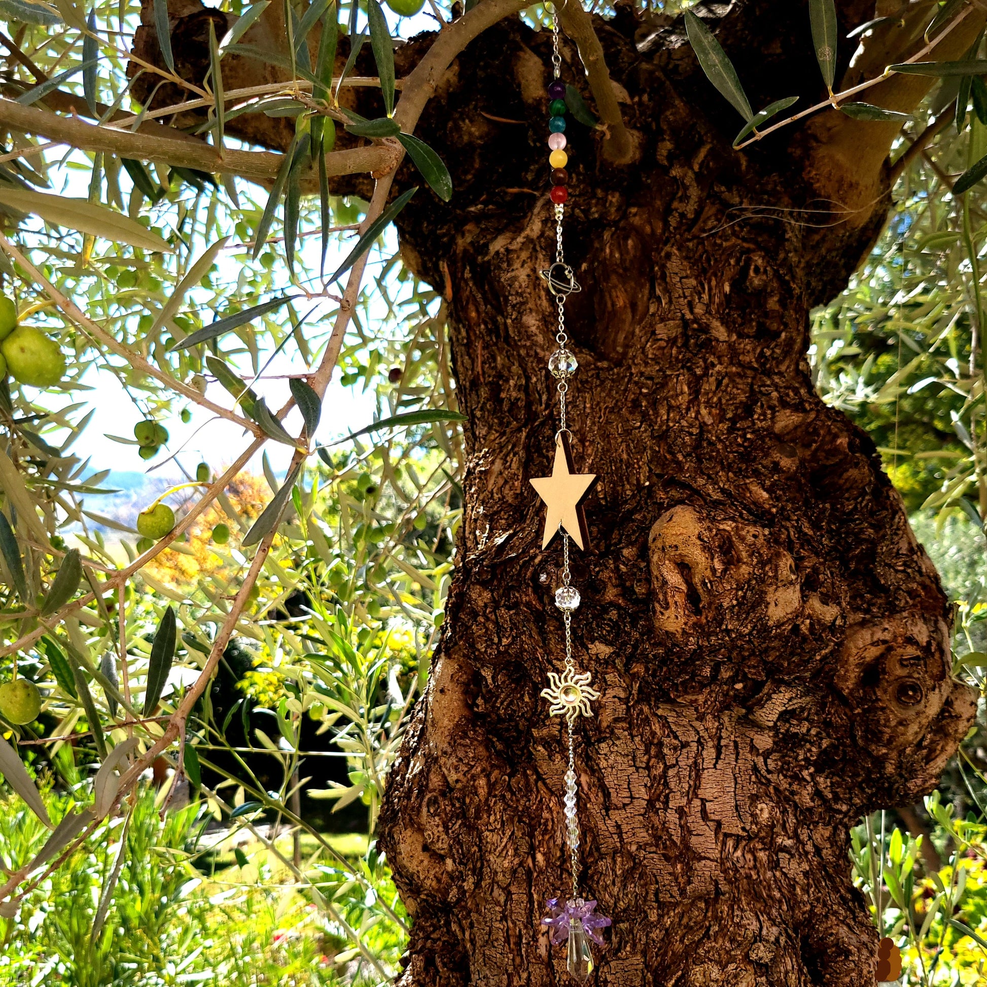 DÉCORATION SUNCATCHER 7 CHAKRAS EN PIERRES & " UNIVERS" avec ÉTOILE EN BOIS + ANGE, SOLEIL & SATURNE - ATTRAPE SOLEIL UNIQUE, ARTISANAL & ORIGINAL