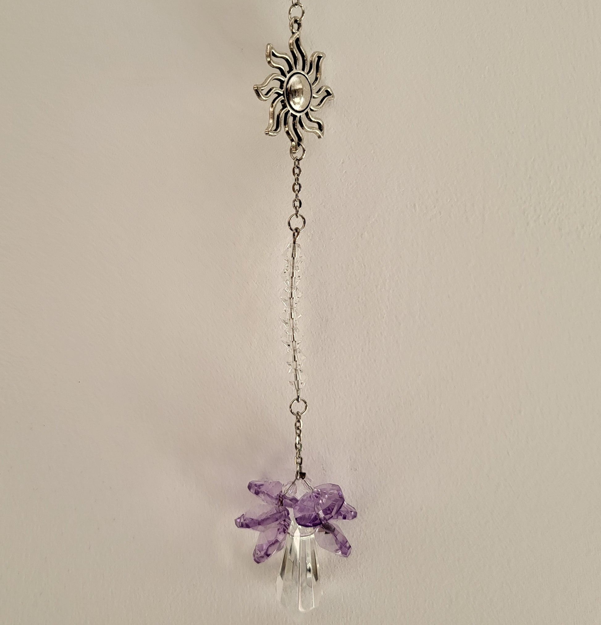 - d'un PRISME en forme D'ANGE avec "POINTE diamant" + 6 PAMPILLES MAUVES en VERRE à FACETTES,