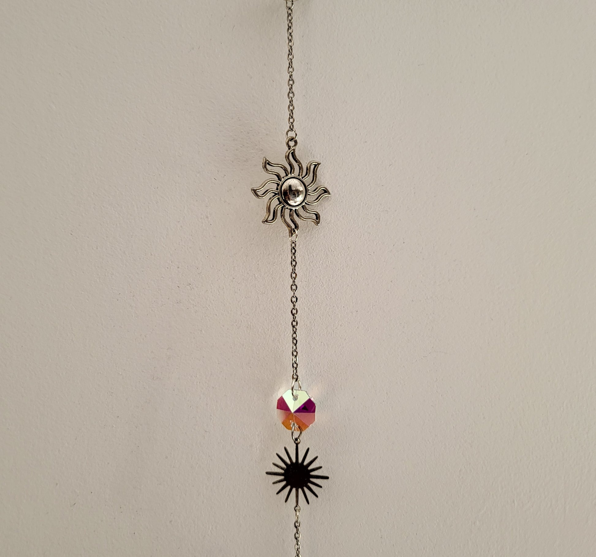 NOTRE 2ème PETIT + : le SUNCATCHER (terme anglais) signifie l’attrape soleil en français. Une très jolie décoration qui attire le regard car elle brille de 1000 feux, d’autant plus dès qu’elle capte une source de lumière, tout particulièrement les rayons du soleil. L’idéal est donc de l’installer près d’une fenêtre bien exposée. Grâce aux nombreux prismes aux multiples facettes (formes et tailles différentes) qui sont répartis sur le suncatcher, il se produit une réaction magique lorsqu’une lumière les traverse. Aussitôt ils se transforment en de magnifiques couleurs irisées, celles de l’arc en ciel (et donc des chakras, pour ceux qui n’auraient pas fait la liaison ! tout est relié !) se diffusant partout dans la pièce. C’est comme un effet « loupe » et ils se déplacent selon l’heure qu’il est ! (et aussi si le suncatcher est en mouvement !!!…). Plus la lumière sera intense, plus les couleurs émises seront vives et pures. Ça produit une ambiance féérique, chaleureuse et apaisante. Et comme vous le savez surement, une belle décoration intérieure harmonieuse, influence positivement notre état émotionnel. Cela procure du bien-être, ça peut réduire le stress et favoriser la paix intérieure.