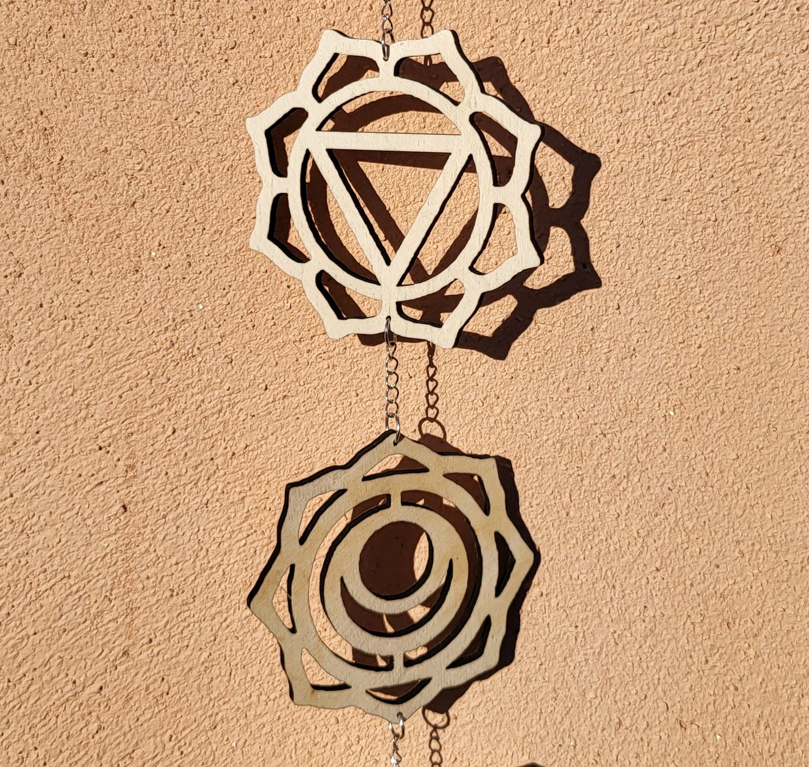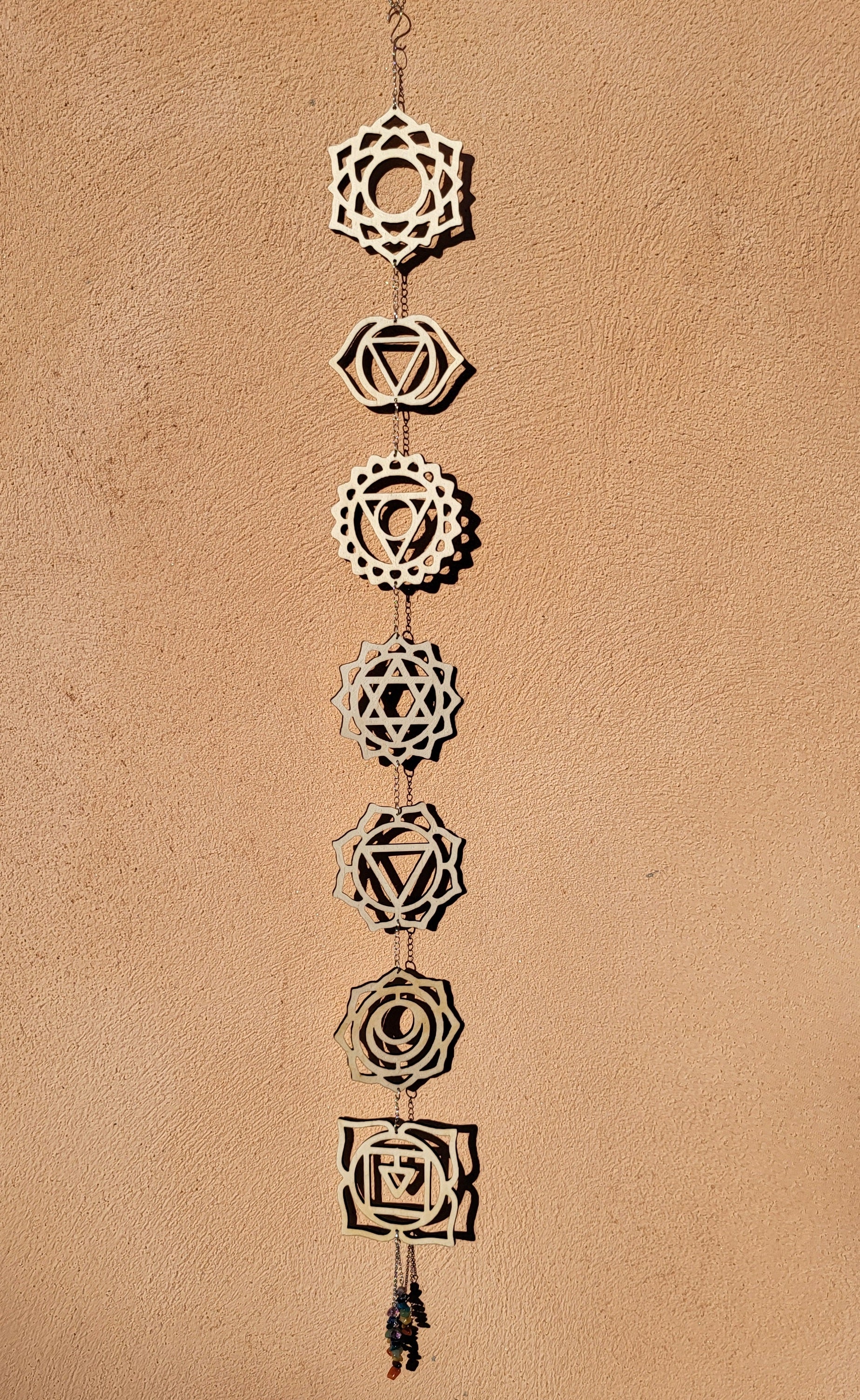 Apportez une touche de spiritualité ZEN à votre intérieur grâce à cette sublime SUSPENSION MURALE 7 CHAKRAS en BOIS, symboles reliés par les chainettes argentées en acier. Cette décoration est ARTISANALE et personnalisée par 3 pendentifs de véritables éclats de PIERRES SEMI-PRÉCIEUSES correspondant précisément à l’ordre des 7 CHAKRAS ! Un vrai bijou à (s’) offrir aux BIENFAITS MULTIPLES. Observez la finesse et les détails qui sont magnifiques, on dirait de la dentelle !