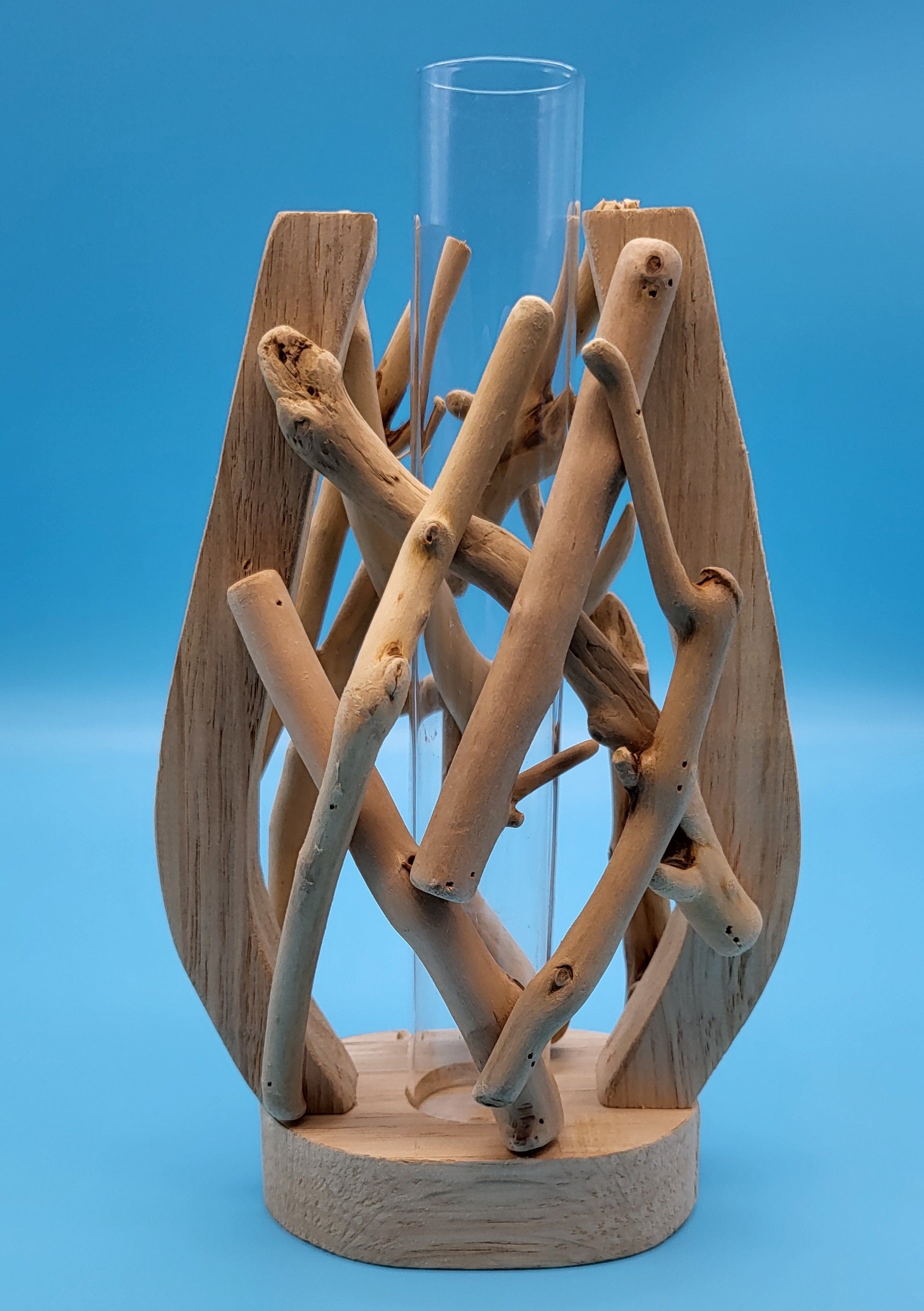 Matières : Bois flotté et vase forme tube en verre transparent.