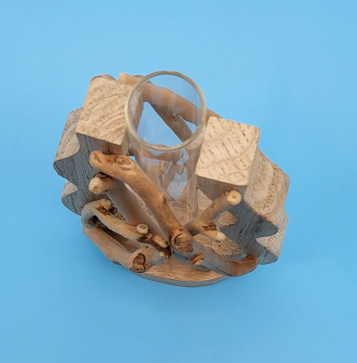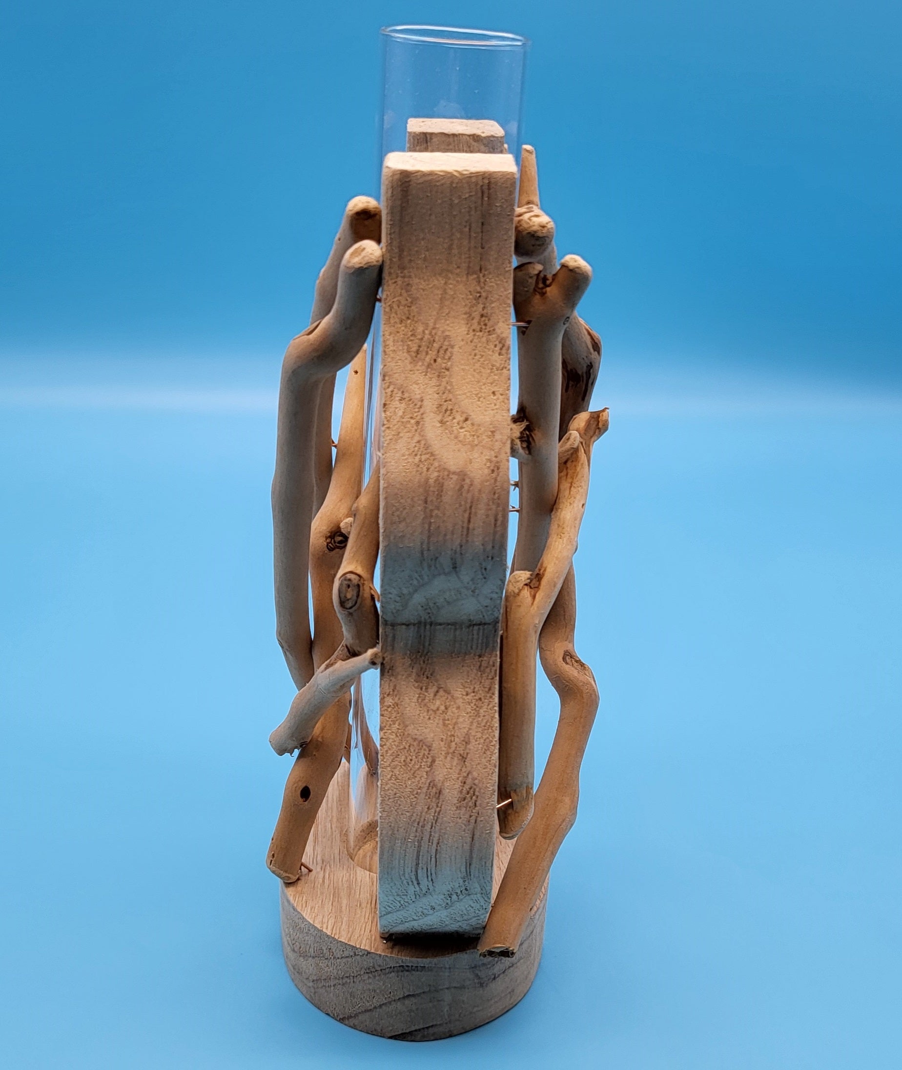 Matières : Bois flotté et vase forme tube en verre transparent.