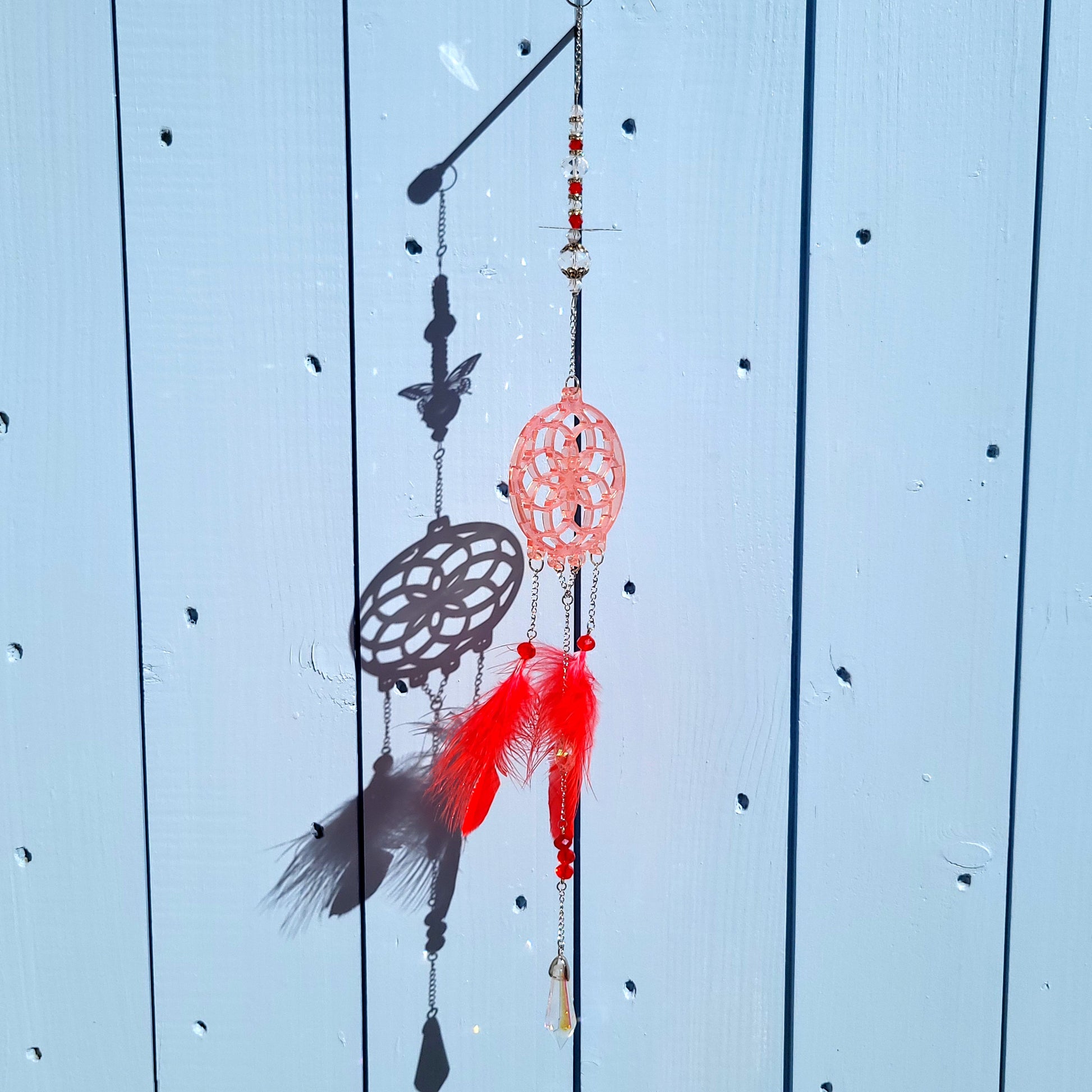 Apportez une touche de sérénité et de beauté à votre intérieur grâce à cette DÉCORATION " 2 en 1 " DREAMCATCHER et SUNCATCHER dans les tons ROUGES ! Cette fois, pour l'originalité, on a eu envie de mélanger un ATTRAPE-RÊVES avec un ATTRAPE SOLEIL !...et aussi jouer sur les différentes matières (résine, métal, verre, plumes...).